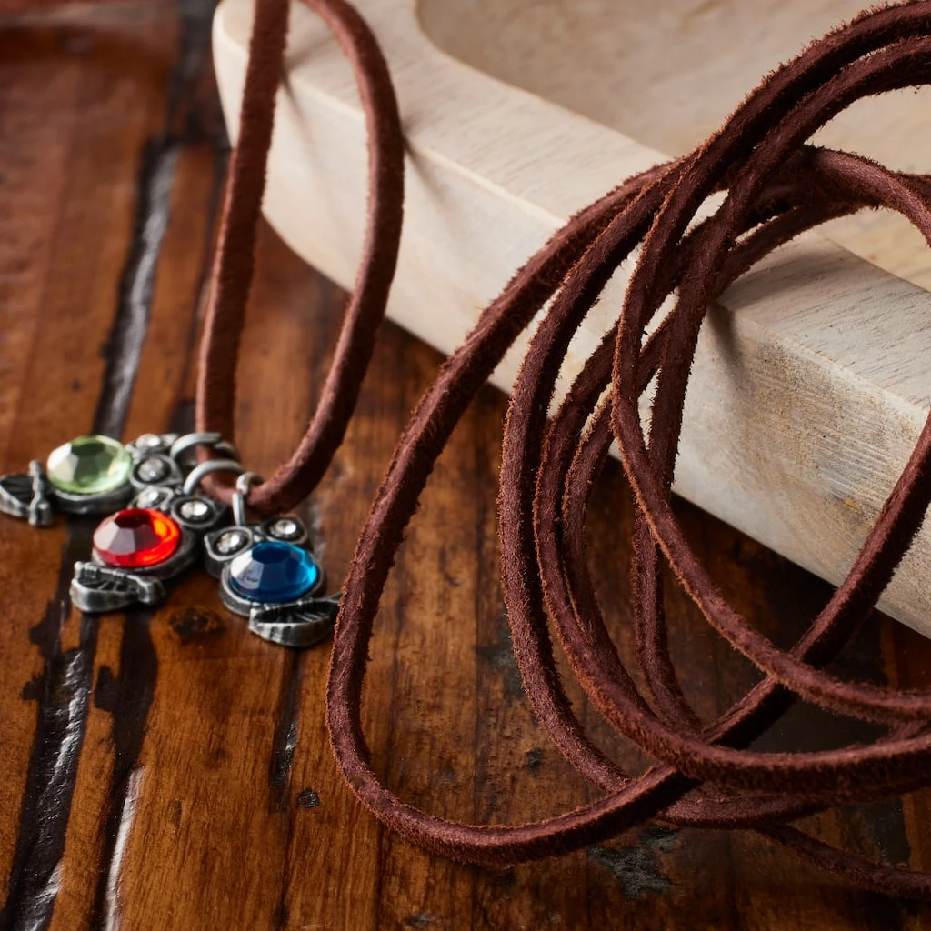 Dress up your craft projects with suede leather lace. Cut from split cowhide leather, it is flexible and has a soft suede surface. It’s perfect for making necklaces, bracelets, garment trims and children’s crafts.