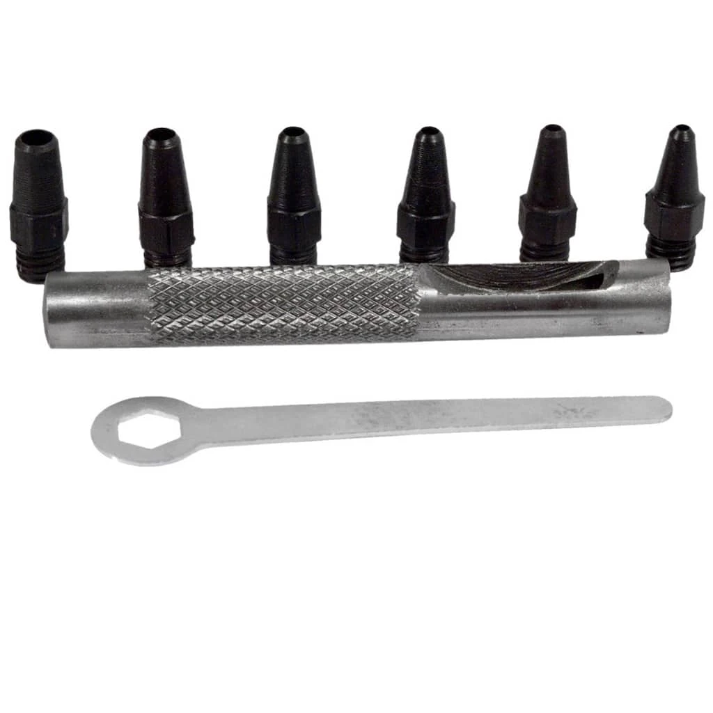 Punch consistently sized holes in leather every time! Made of solid metal, this durable punch set contains the six most commonly used hole sizes. It’s perfect for punching holes in belts, wallets, handbags and other leathercraft projects.
